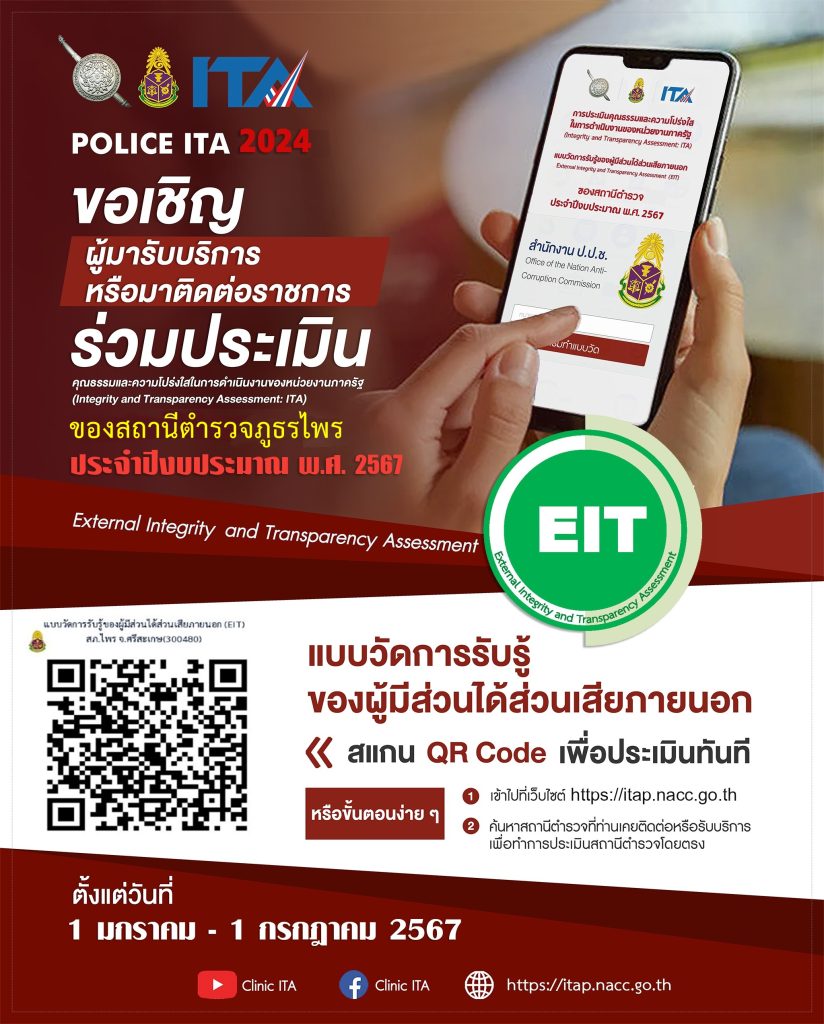 ขอเชิญผู้มารับบริการหรือมาติดต่อราชการ ร่วมประเมินคุณธรรม และความโปร่งใสในการดำเนินงานของหน่วยงานภาครัฐ (Integrity and Transparency Assessment: ITA) ของ สภ.ไพร ประจำปีงบประมาณ พ.ศ. 2567