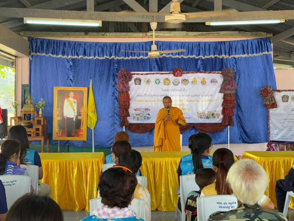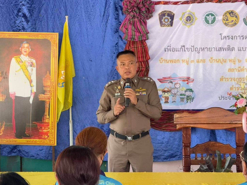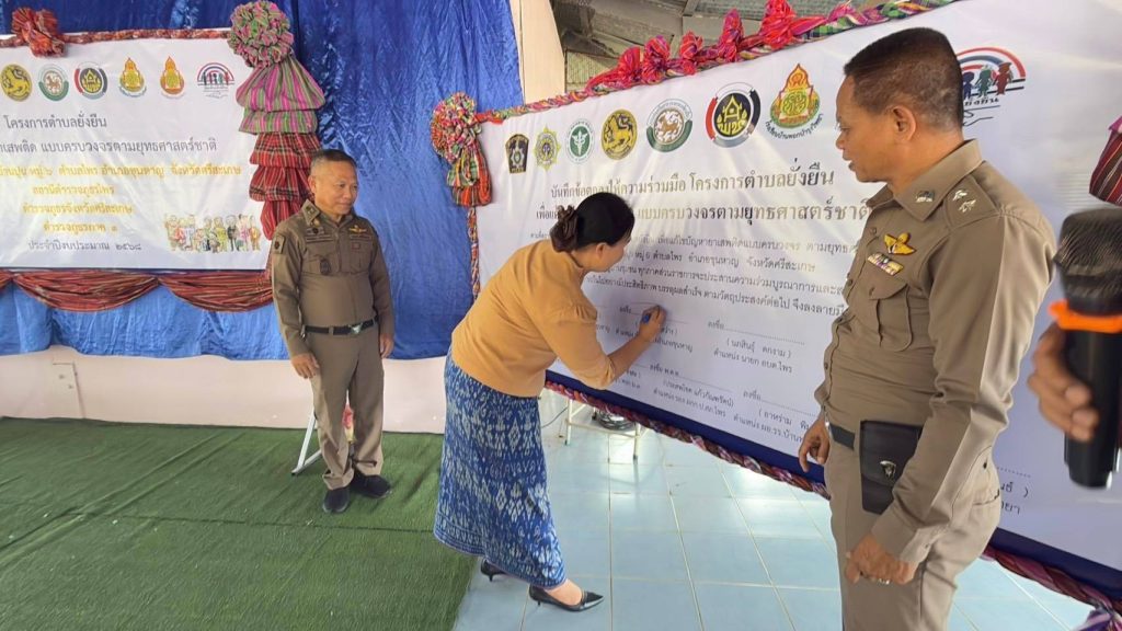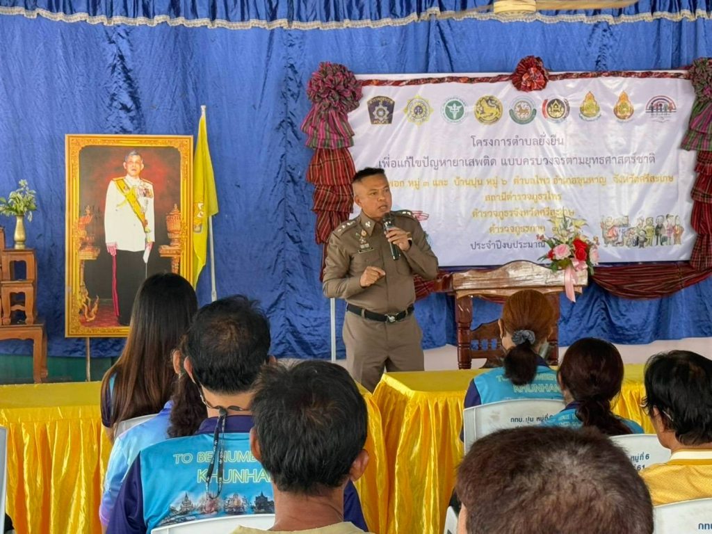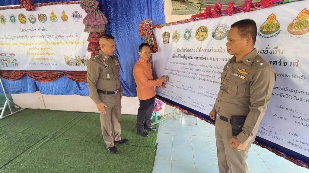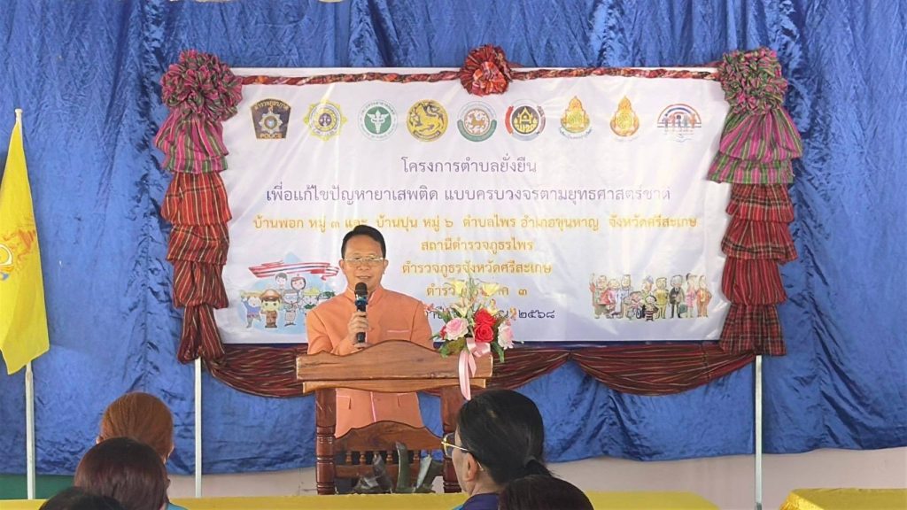 วันที่ 12 มี.ค. 2568 เวลา 09.00 น. พ.ต.อ.พงศ์ยุทธ์ แก้วดอนรี ผกก.สภ.ไพร พ.ต.ท.ประสพโชค แก้วกัณฑรัตน์ รอง ผกก.ป. สภ.ไพร พ.ต.ท.ประสาร มณีวรรณ์ สวป.สภ.ไพร พร้อมด้วย สาธารณสุขอำเภอขุนหาญ พัฒนาการอำเภอขุนหาญ นายกองค์การบริหารส่วนตำบลไพร กำนันตำบลไพร ผู้ใหญ่บ้านพอก หมู่ 3 ต.ไพร ผอ.รพ.สต.บ้านซำเขียน ผอ.รร.บ้านปุนวิทยา ผอ.รร.บ้านพอกบำรุงวิทยา ชุดปฏิบัติการโครงการตำบลยั่งยืนฯ สภ.ไพร และภาคีเครือข่าย ร่วมเปิดโครงการตำบลบำบัดอย่างยั่งยืน ในพื้นที่แพร่ระบาดยาเสพติด ตามนโยบายเร่งด่วนของรัฐบาล ประจำปีงบประมาณ 2568 และลงนามในบันทึกความร่วมมือ MOU ทำการประชาคมชาวบ้านในหมู่บ้าน ตามแนวทางในการดำเนินโครงการ ณ ศาลาประชาคมบ้านพอก ม.3 ต.ไพร อ.ขุนหาญ จ.ศรีสะเกษ โดยมี นายปวิช รัตวาลย์ นายอำเภอขุนหาญ เป็นประธานในพิธี